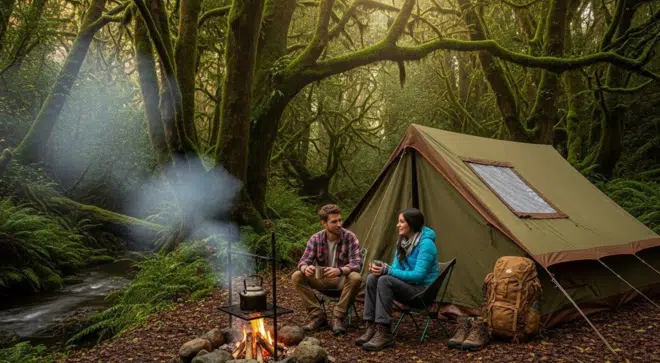 لم تمر لحظة حتى انطلقت أصوات الموسيقى والرقص وسط الغابة . بدا لهم الصوت قَرِيبًا منهم جِدًّا . وقتئذٍ فتح اليكس خيمتهُ حتى يتثنى لَهُ رؤية المشهد. حينها شاهد جمع من الناس يجلسون في حلقة دائرية والنار تتوسطهم مع فرقة موسيقية وأغاني هادئة، هُنَا قال اليكس :