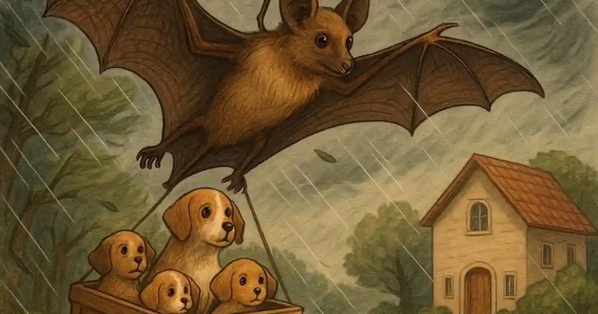 ثم جاء يوم عصفت فيه أعاصير مهلكة بالغابة، ففرّت الحيوانات طلبًا للنجاة، لكنها عجزت عن بلوغ الضفة الآمنة من النهر. عندئذ صنع الثعلب الطائر مظلة عظيمة، ووضع الكلب وأهله في صندوق، ثم حلق بهم فوق الرياح حتى أنزلهم سالمين في بيت جميل على الضفة الأخرى.